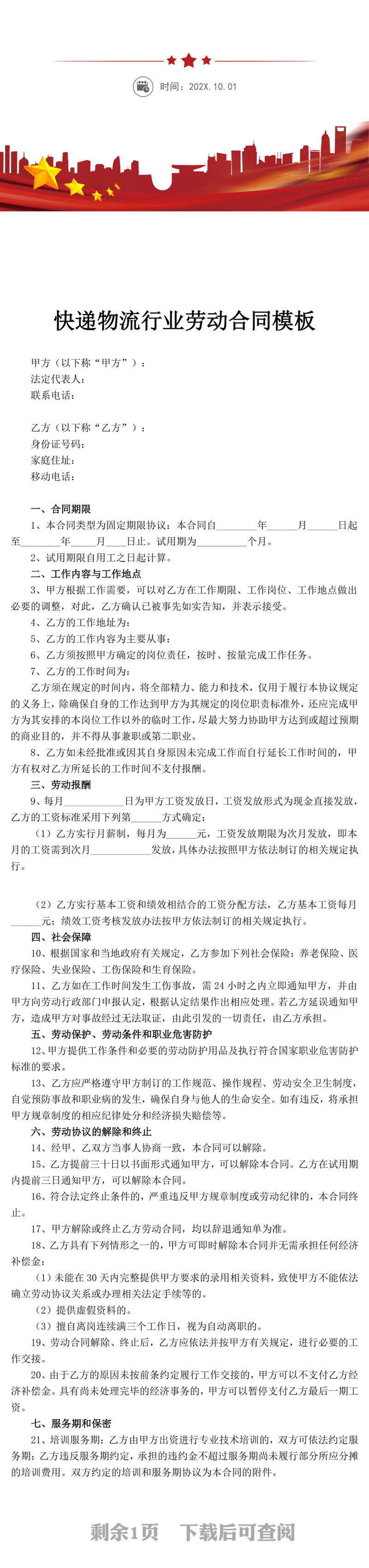 快递物流行业劳动合同模板,word文档,下载,word,白色,免费模板,word格式,公司文档,文件,合同,打印合同,电子文档,word模板,商务,商务文档,简洁大方,可编辑文档,劳动合同,合同模板