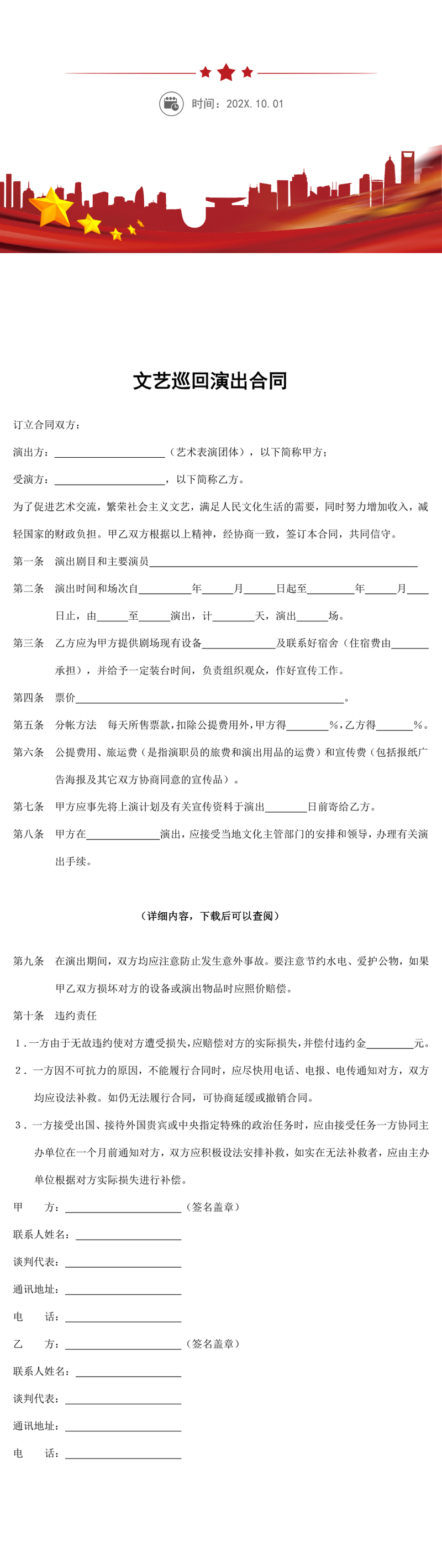 办图网提供文艺巡回演出合同word文档供会员免费下载,作品支持软件Word ,格式为doc/docx。更多精彩合同素材,尽在办图网。